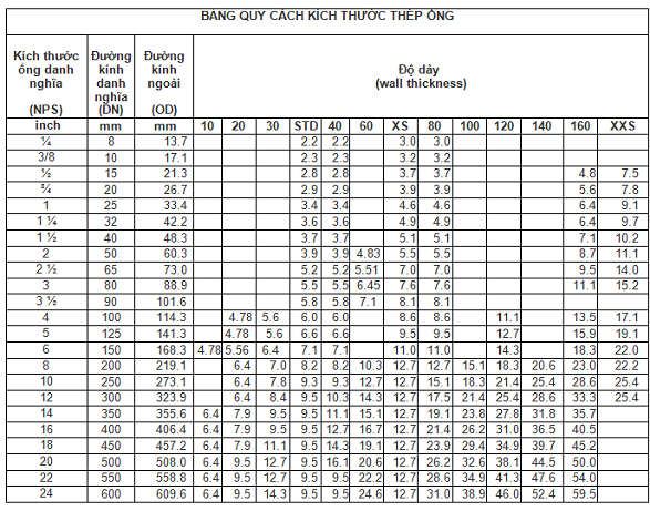 BẢNG QUY CÁCH THÉP ỐNG ĐÚC CHỊU NHIỆT ĐỘ CAO